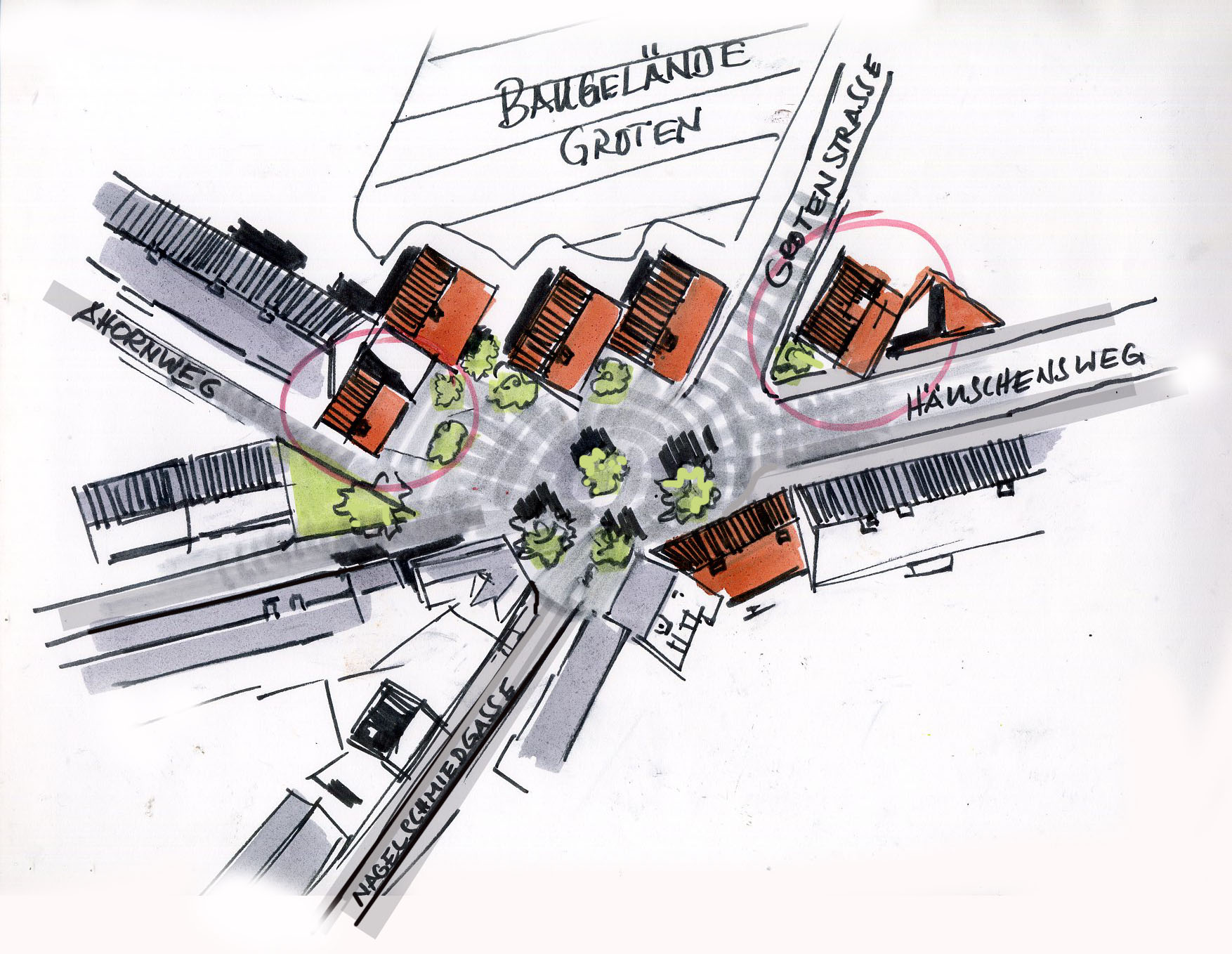 Die Planungen sind schon fast 20 Jahre alt und auch seit der Fertigstellung der Wohnsiedlung ist nun einige Zeit vergangen. Doch noch immer hat die geplante Umgestaltung des Platzes vor dem Café Herzhäuschen nicht begonnen, obwohl der Bebauungsplan längst vorhanden ist: